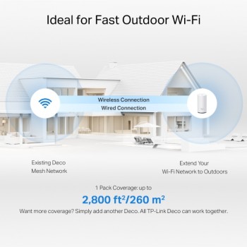 | Lyhyt yhteenveto | TP-Link Deco BE25-Outdoor – Ulkokäyttöön suunniteltu WiFi 7 -tukiasema huippunopeudella ja älykkäällä roamingilla Laajenna WiFi 7 -verkko myös ulkotiloihin Deco BE25 Outdoor -mesh-tukiaseman avulla. Jopa 5 Gbps:n yhdistetty kaksitaajuus-WiFi (4324 Mbps @ 5 GHz + 688 Mbps @ 2.4 GHz) ja kaksi 2.5 Gbps Ethernet-porttia takaavat ensiluokkaisen suorituskyvyn niin langattomissa kuin langallisissakin yhteyksissä – olipa kyseessä terassi, piha tai varasto. |