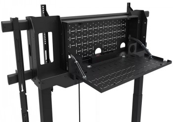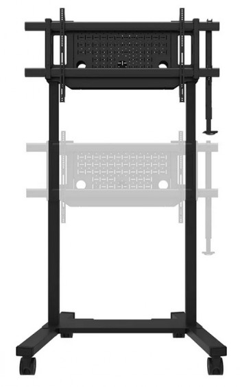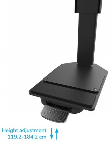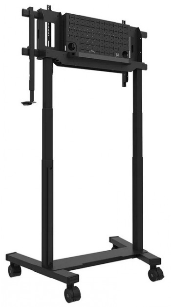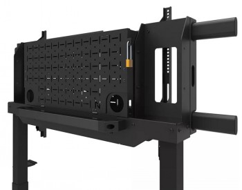 The Neomounts FL55-975BL1 MOVE Lift XL is the ideal motorised trolley for large displays up to 115" and 160 kg. The heavy-duty stand offers 65 cm of motorised height adjustment, allowing both seated and standing presentations at the perfect viewing height and raising the screen above the audience. Operation is smooth and precise via a conveniently positioned control panel. The anti-collision system ensures safe height adjustments, and the brackets can be locked with a padlock (not included) for extra security. A ventilated, lockable hardware compartment with a cable opening can be optionally installed to provide clean and secure equipment storage.